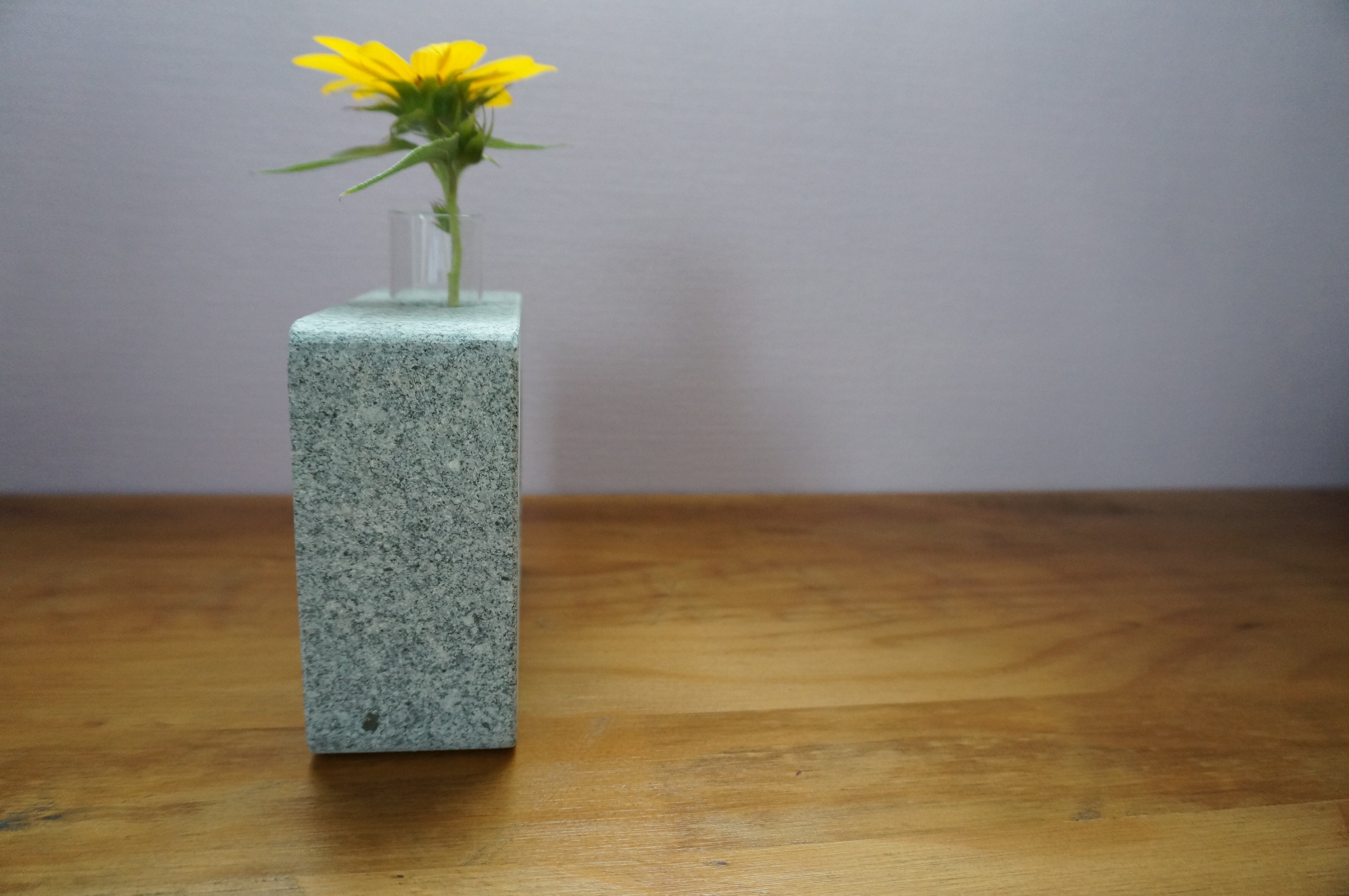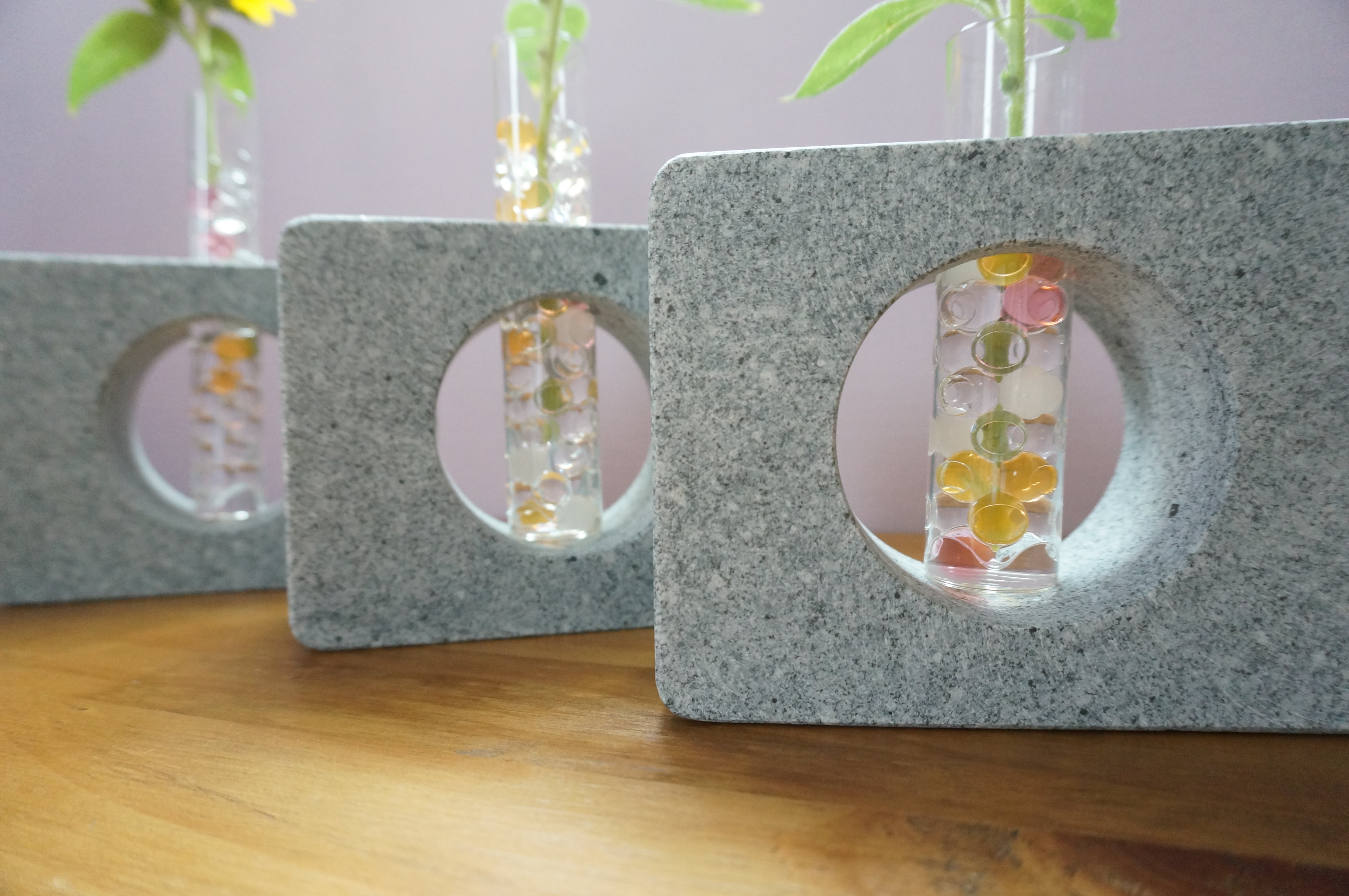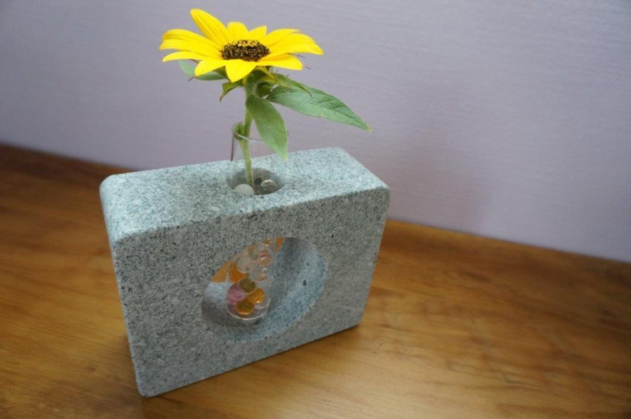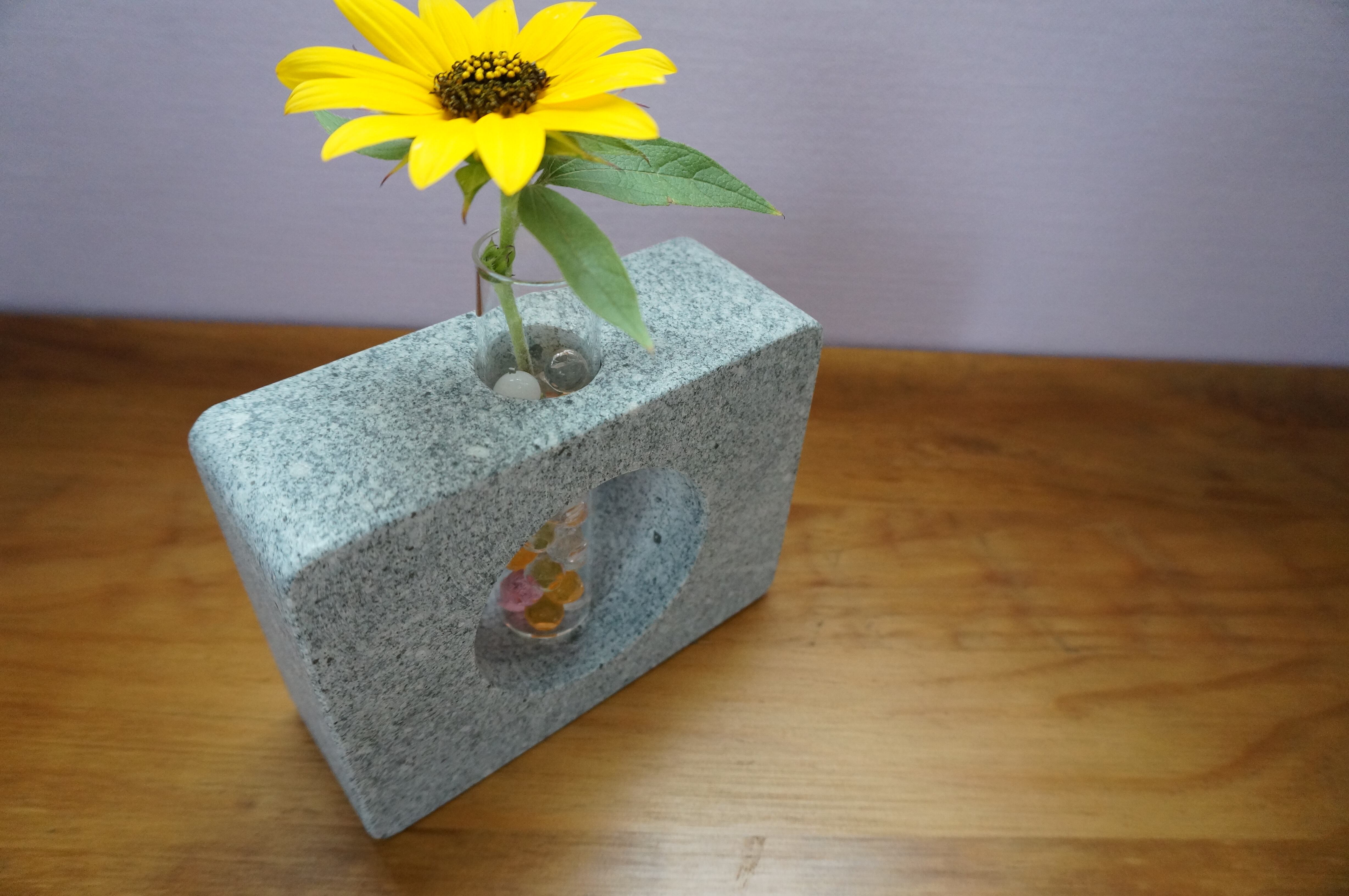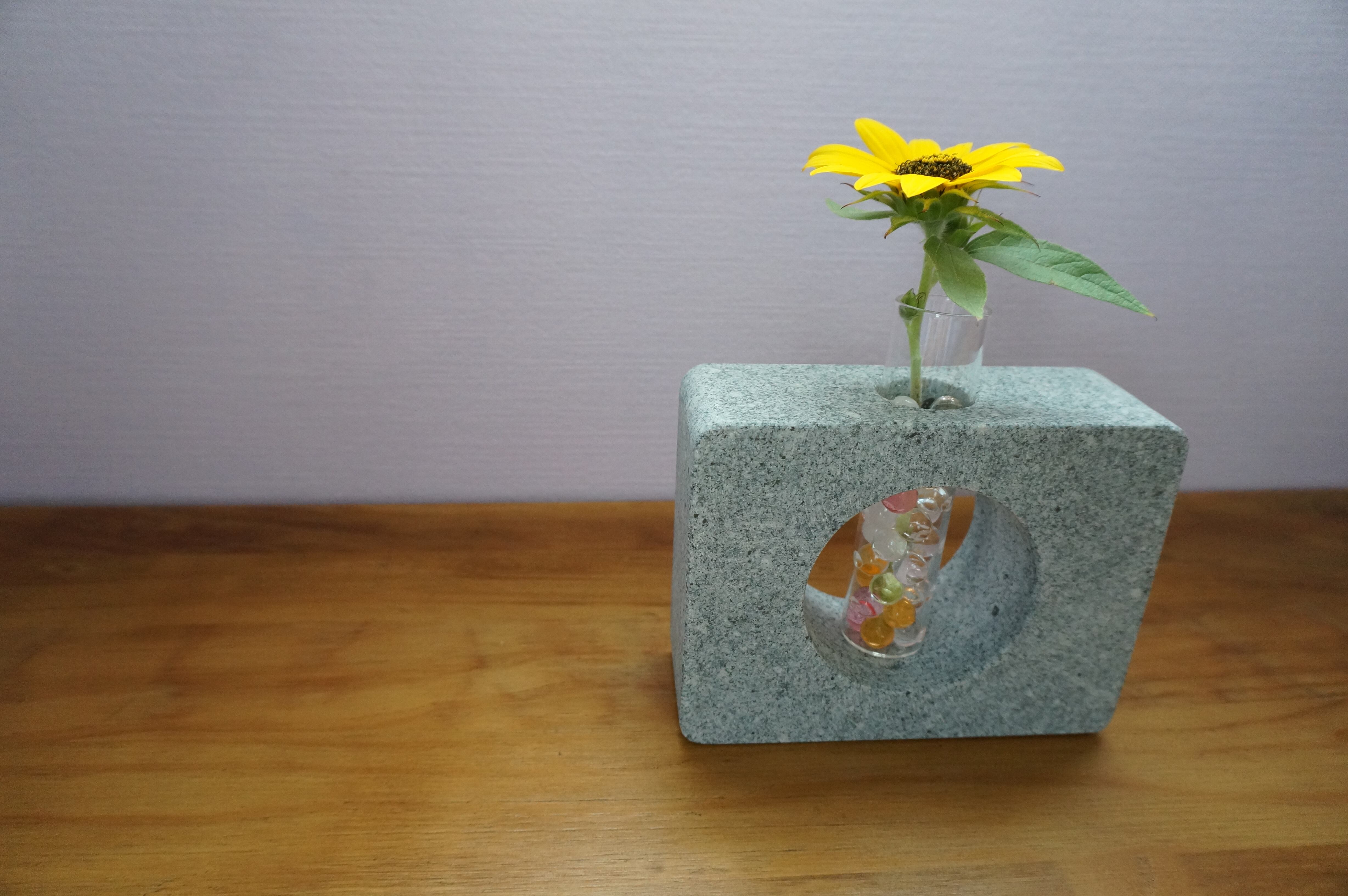ガラス管に光が差し込むようなデザインの石のフラワーベースです。