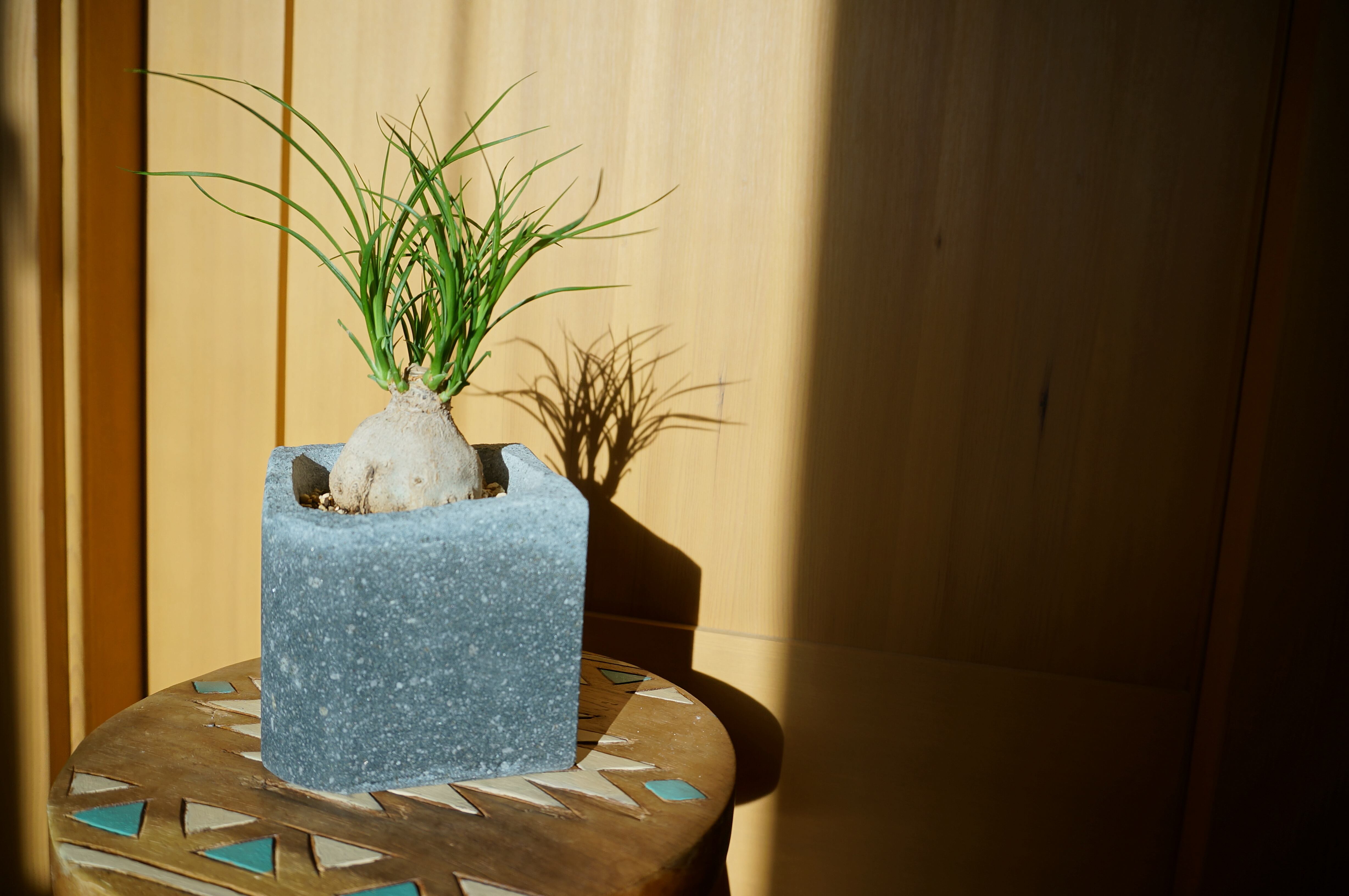 どっしりとしたフォルムの塊根植物がよく似合う、石の皮肌を活かした大門石のポットです。
