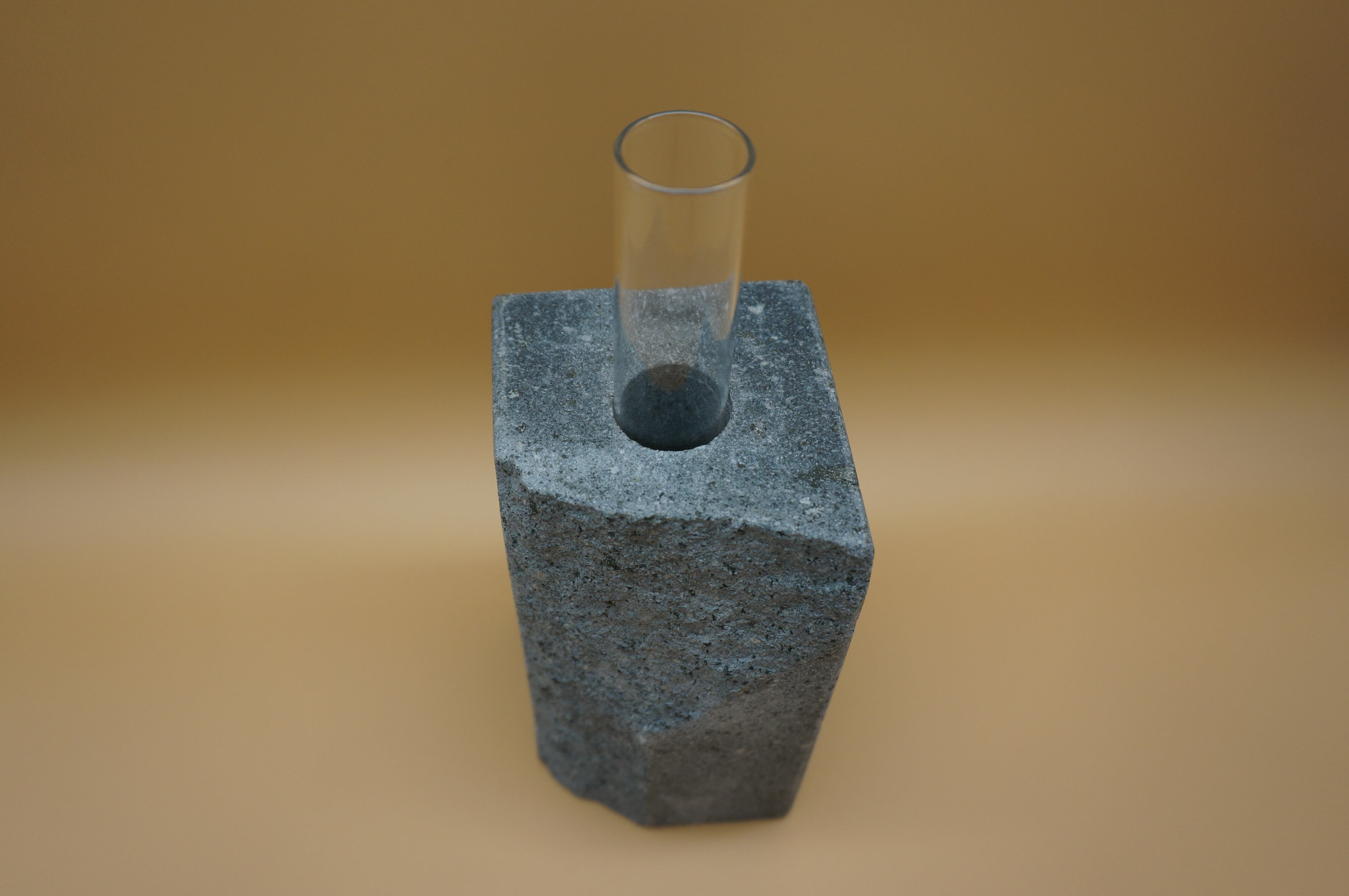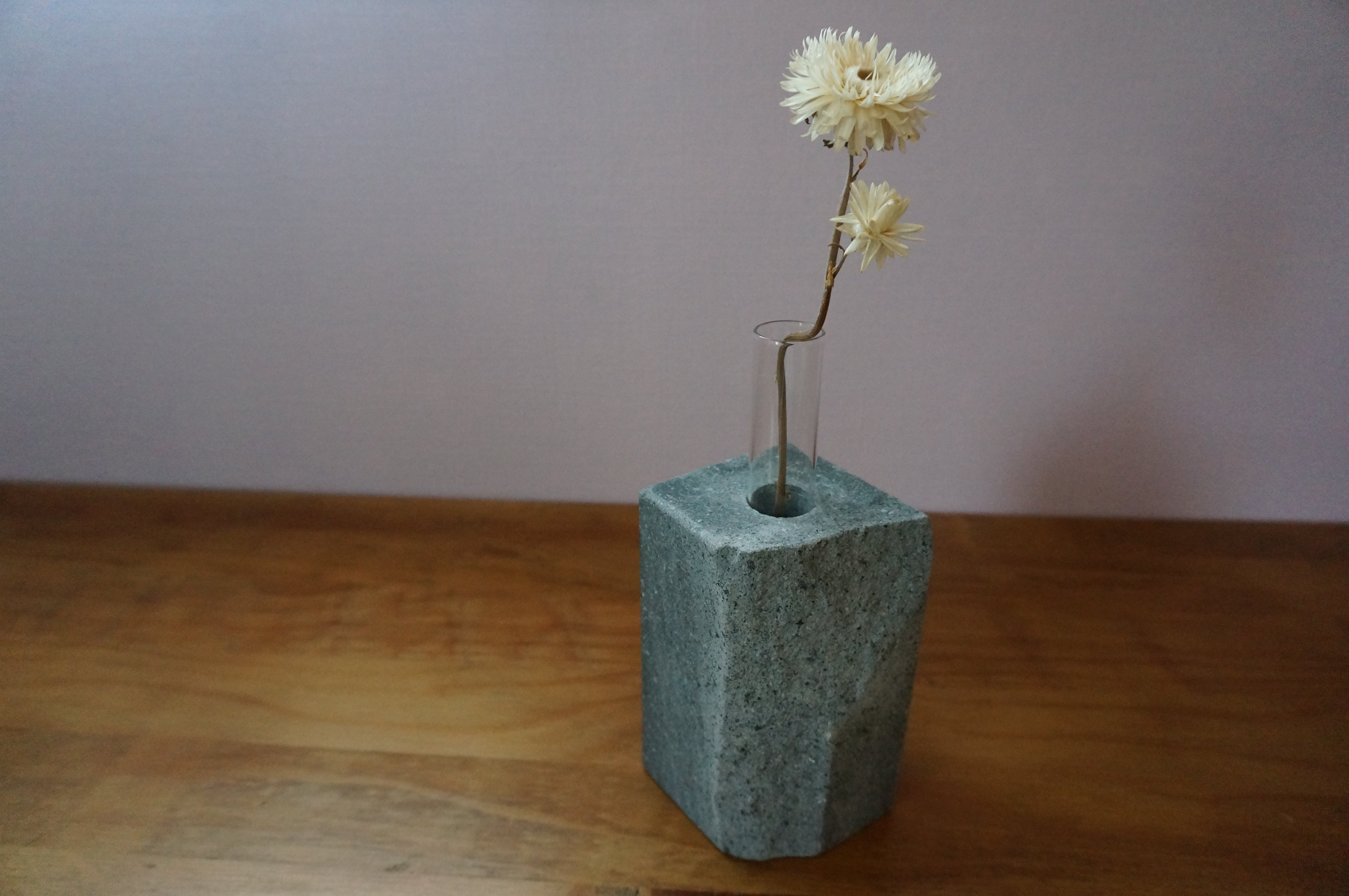 スクエアなデザインと、不規則な石の割れ肌が特徴の一点物のフラワーベースです。